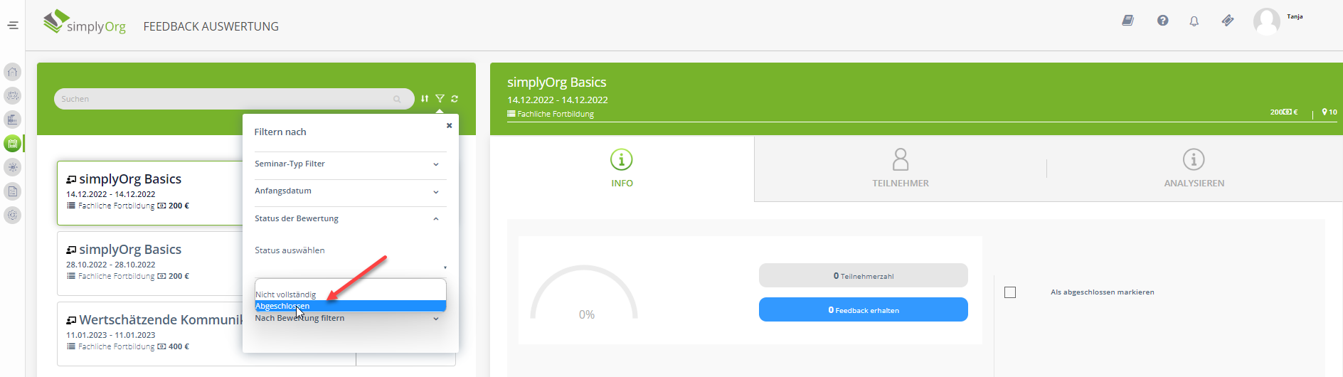 Ein als "abgeschlossen" markiertes Feedback wird nicht mehr in der Übersicht angezeigt
