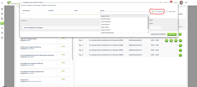5. Wenn Sie möchten, dass der Trainer angezeigt wird, der im Seminar Planer hinterlegt wurde, löschen Sie den "voreingestellten" Trainer aus dem Zeitplan.