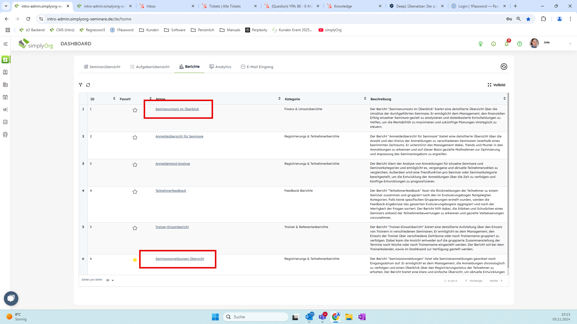 Mit der Funktion "Berichte" im Dashboard können folgende Listen dafür verwendet werden: