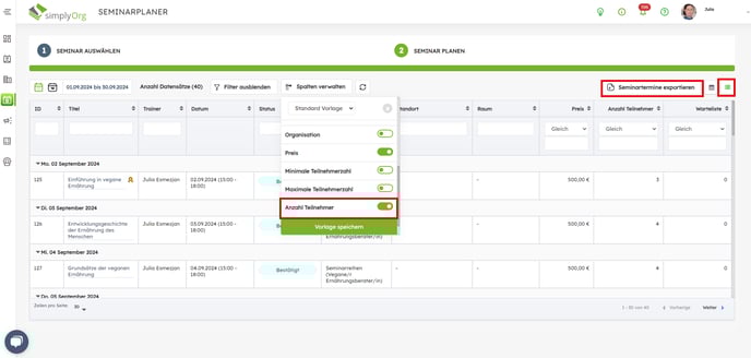 Alternativ können Sie die Seminarlistenansicht im Seminarplaner verwenden: