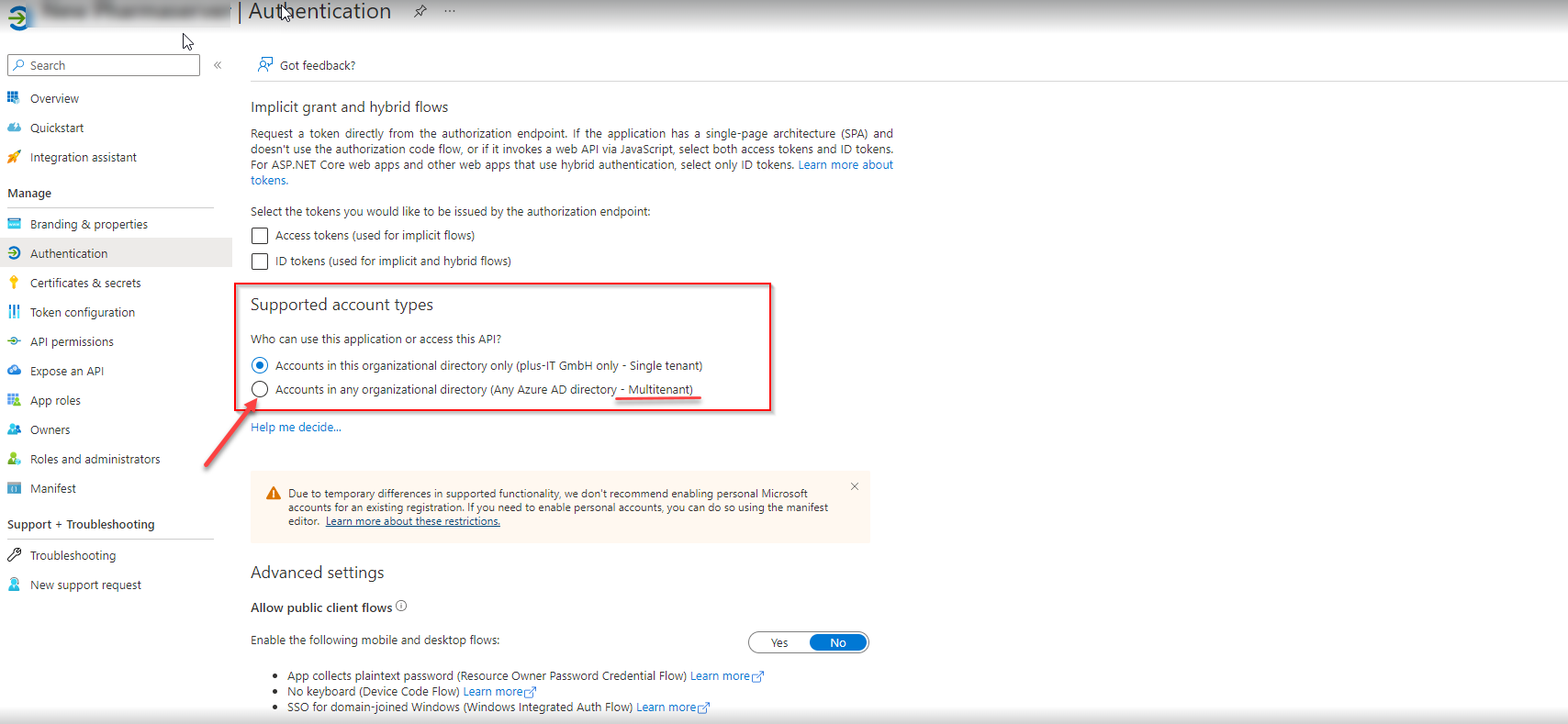 Im für die Synchronisation benötigten Azure Account, gibt es in den Einstellungen unter "Berechtigungen" die Option "Multitenant". Diese muss ausgewählt sein, ansonsten lässt das System die Synchronisation mit "externen" E-Mail-Adressen nicht zu.