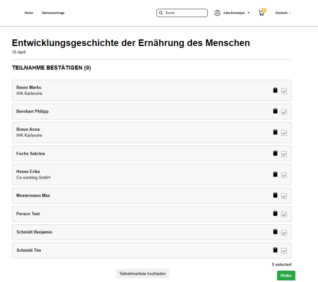 Ein Trainer kann den Status eines Teilnehmers auf "teilgenommen" setzen. Dies funktioniert jedoch nur pro Teilnehmer und nicht für alles Teilnehmer eines Seminares.