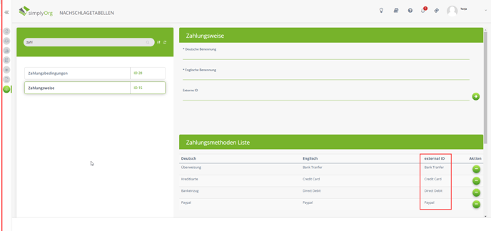- Diese können bearbeitet werden, die externe ID darf nicht verändert werden, sonst funktioniert die Zahlungsweise im Portal nicht.