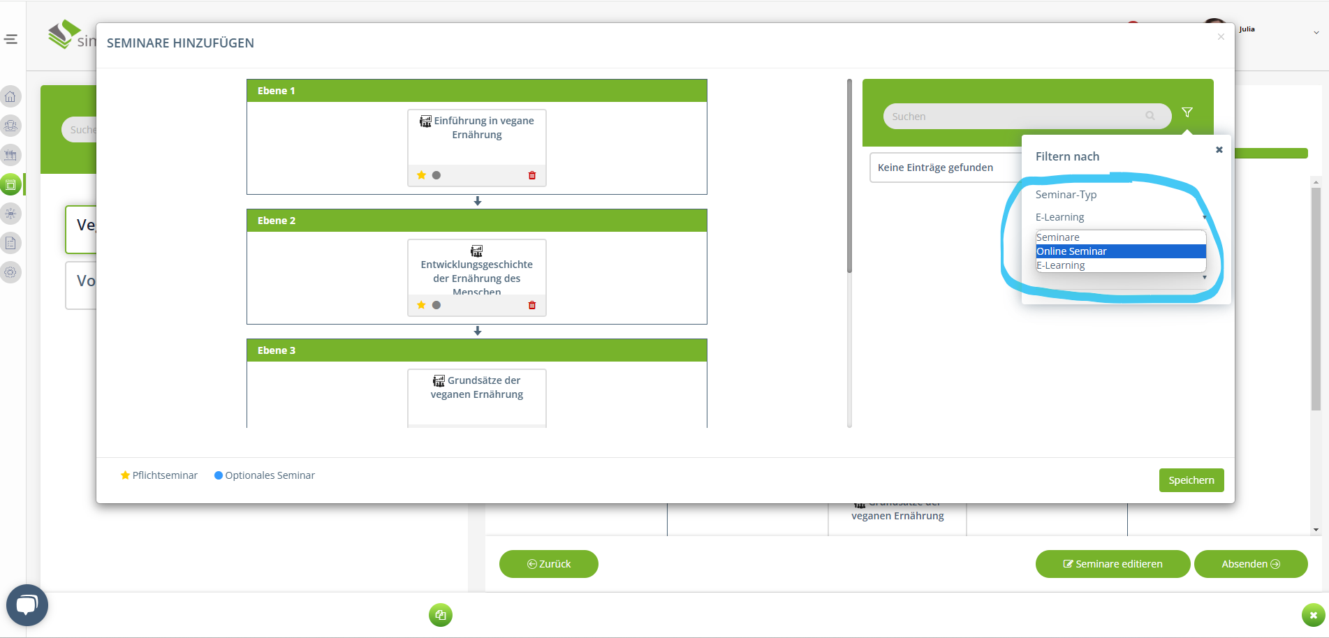 Anlegen einer Seminarreihe mit Online Seminaren und Vor-Ort-Seminaren und E-Learnings