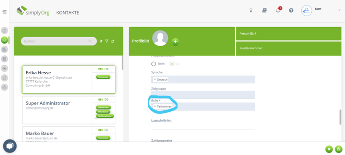 Ein Teilnehmer/Kontakt kann sich selbst keine Rolle vergeben oder diese ändern. Dieses Recht ist ausschließlich den simplyOrg Backendnutzern vorbehalten.