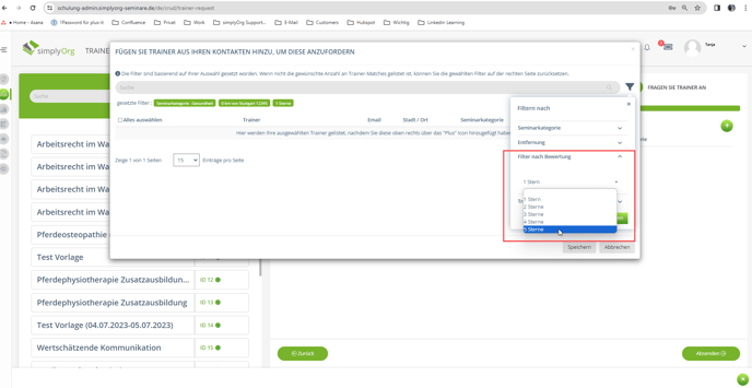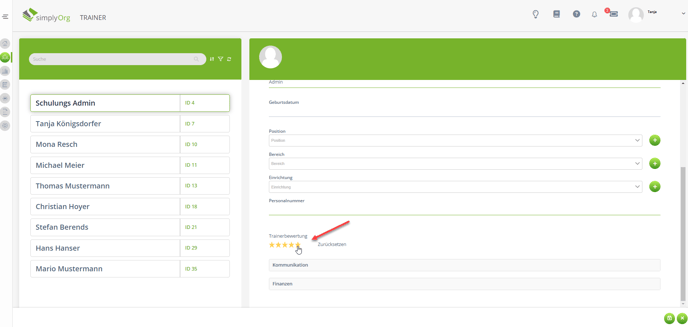 Die Sterne der Bewertung eines Trainers werden im Backend von einem Sachbearbeiter/Administrator bei der Erstellung eines Trainer vergeben. Diese Bewertung kann für die Filterfunktion im Modul "Traineranfrage" genutzt werden.