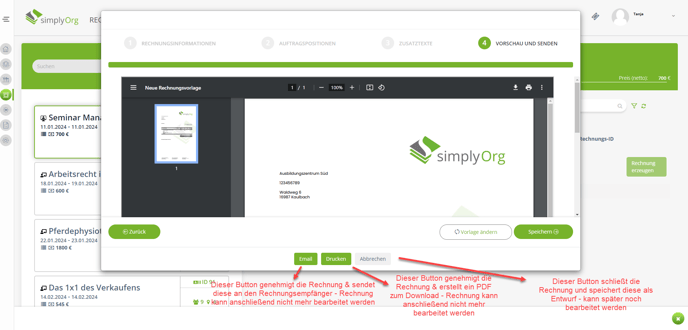 Wenn eine Rechnung in der Registrierung für Seminare, Seminarreihen, E-Learnings, etc. generiert wird, wird die Rechnung als Entwurf gespeichert. Im letzten Tab besteht die Möglichkeit, die Rechnung zu speichern, per E-Mail zu senden, zu drucken oder die Rechnung mit Klick auf "Abbrechen" als Entwurf zu speichern. Weitere Informationen siehe Screenshot: