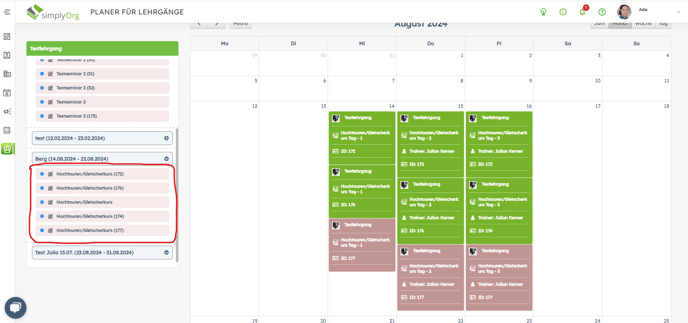 Bei Planen von Seminaren/Modulen/Fachrichtungen/Kapiteln tauchen diese verplanten Termine eines Lehrgangs wieder in der linken Spalte auf, wenn diese bereits verplant sind. Beispiel: Der Hochtouren/Gletscherkurs war bereits am 14.08.2024 geplant und wird zu diesem Zeitpunkt erneut geplant. Ist dies der Fall listet das nochmals geplante Seminar erneut auf. Die Planung desselben Seminares ist möglich, wenn der Trainer getauscht wird oder das Seminar an einem anderen Tage geplant wird (innerhalb Lehrgangsbeginn und -ende). Jedes Einzelseminar erhält eine eigene ID.