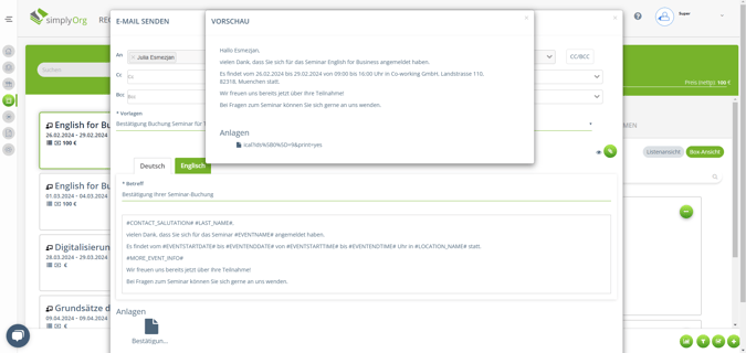 Inhalt in der E-Mail Vorschau wird nicht angezeigt obwohl ein Platzhalter beim E-Mail Versand in der Registrierung für Seminare hinterlegt ist.