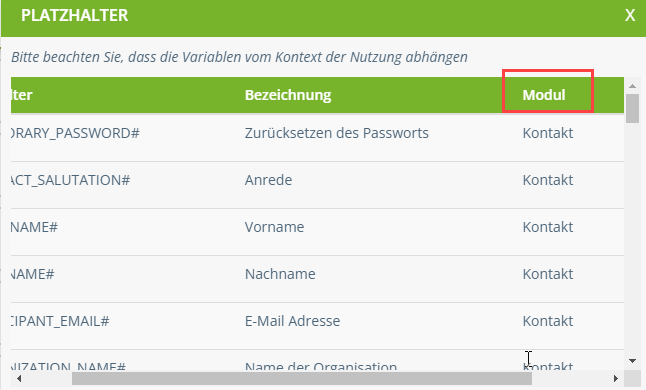 9. Im Fenster der E-Mail-Variables können Sie unter der Spalte "Modul" einsehen, für welches Modul der Platzhalter verwendet werden kann. Im Detail finden Sie dies auch in unserem simplyOrg Benutzerhandbuch
