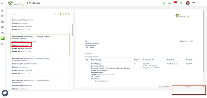Wenn Sie im Rechnungsmodul rechts unten keine Button mehr zu Auswahl haben, um z.B. eine Rechnung zu löschen, dann liegt das höchstwahrscheinlich daran, dass diese Rechnung für einen Lehrgang automatisiert erstellt wurde. Mit diesen Rechnungen kann nichts mehr gemacht werden (Bearbeiten, Genehmigen, Stornieren, Abbrechen, Löschen oder Vorschau). Diese Rechnungen können auch den Status "Bevorstehend" haben, sofern diese noch nicht durch den Lehrgangsplaner genehmigt wurden. Die bevorstehenden Rechnungen werden auf Basis von Zahlungsplänen vom System automatisiert versendet.