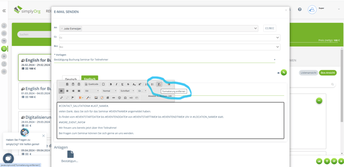 Der eingefügte Text im Texteditor z.B. beim Versenden von Bestätigungsmails in der Seminarregistrierung hat eine andere Formatierung als das was in der E-Mail-Vorlage eigepflegt wurde.