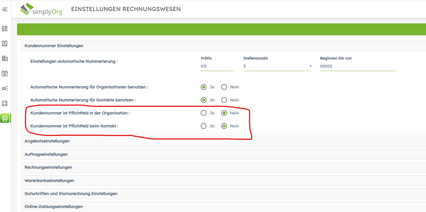 Dort können Sie nun auswählen ob die Angabe der Kundenummer im Kontakt und/oder Organisationsmodul ein Pflichtfeld sein soll