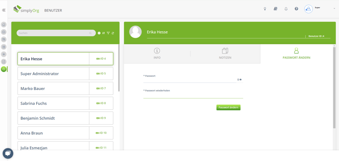 Für Backendnutzer können Passwörter gesetzt werden, die auch geändert werden können, durch andere Backendnutzer mit der entsprechenden Berechtigung (Super-Admin erforderlich).