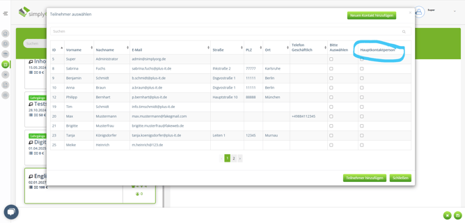 Beim Hinzufügen von Teilnehmern in der Registrierung für Seminare muss eine Hauptkontaktperson mit dem Setzen eines Häkchens ausgewählt werden.