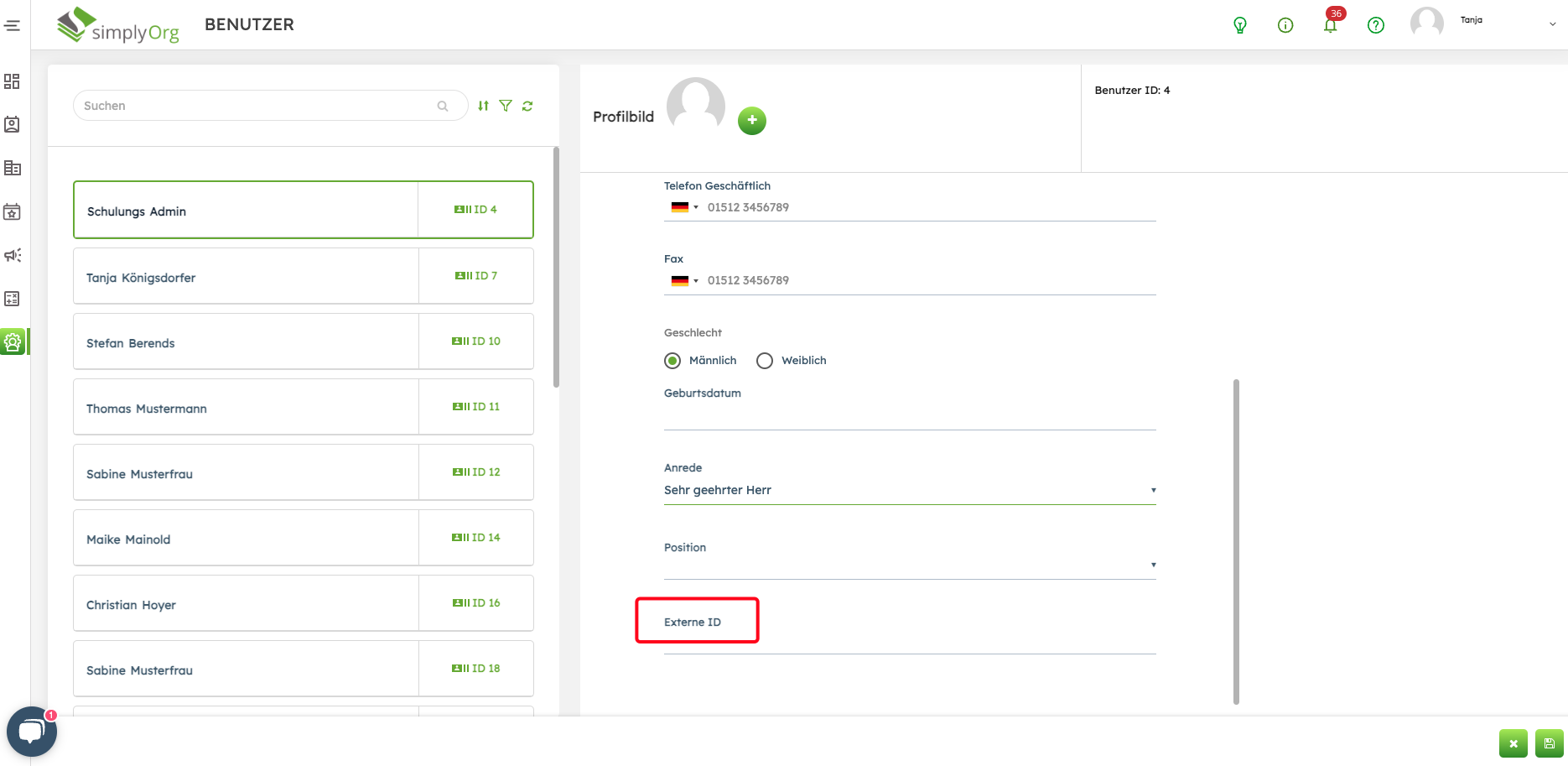 Rollen und Berechtigungen je Benutzer im simplyOrg Backend, speziell "Externe ID".