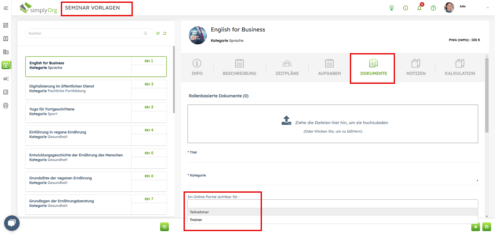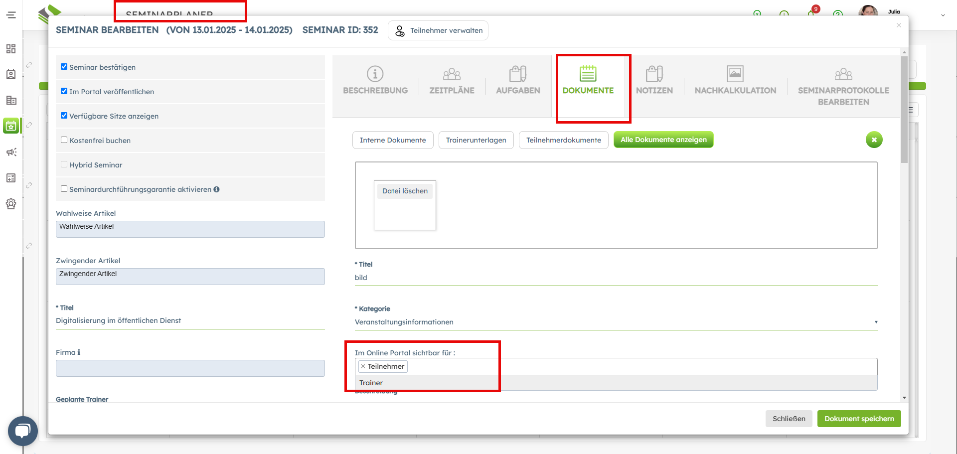Sie können im Backend einstellen, für wen die Dokumente ersichtlich sein sollen. Dies ist sowohl in den Seminar Vorlagen als auch im Seminarplaner für jedes einzelne Seminar umsetzbar.