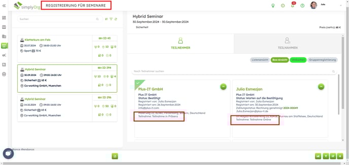 Eine "Teilnahme in Präsenz" oder "Teilnahme Online" wird angezeigt, sobald ein Seminar als Hybrid Seminar geplant ist (Hybrid Seminare sollten als Seminar Vorlagen angelegt sein). Im Seminarplaner kann bei der Planung dieser Seminare ausgewählt werden, ob dieses Seminar als hybrides Seminar angeboten werden soll. Abhängig davon, was im Seminarplaner ausgewählt wird, wird im Modul "Registrierung für Seminare" und im Buchungsportal die entsprechende Anzeige erscheinen.
