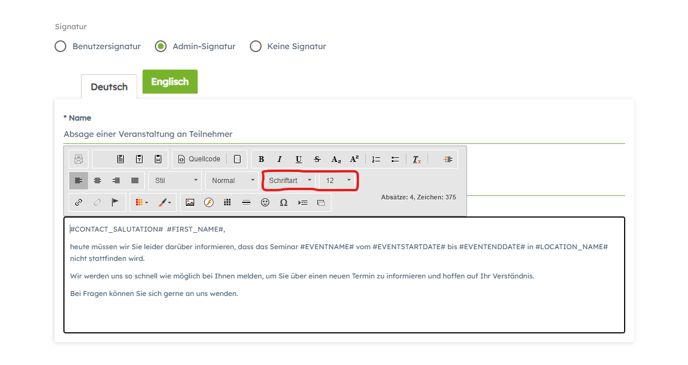 Die Bearbeitungsmöglichkeit von Texten in E-Mail Vorlagen oder auch Seminar/Online Seminar Vorlagen ist ein CKEditor und somit ein externes Tool, das an simplyOrg angebunden ist. Bei initialer Einstellung oder Veränderung der Texte, zeigt dieses Tool nicht an, welche Schriftgröße und -art voreingestellt sind. Sobald einmal hier eine Änderung vorgenommen wird, wird dies jedoch abgespeichert und künftig angezeigt.