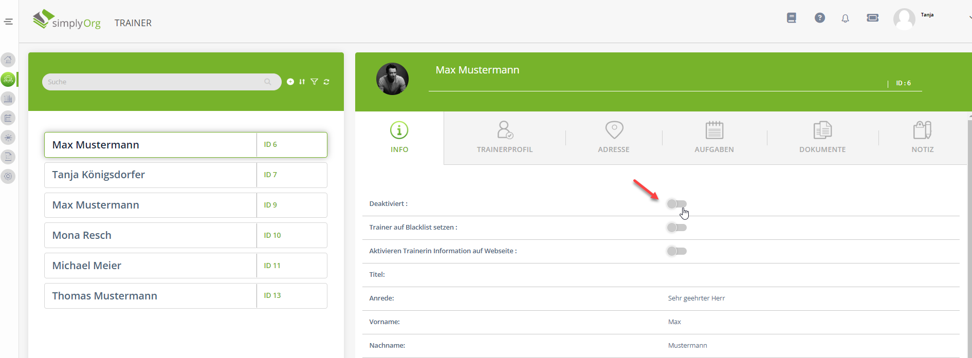 Wird ein Trainer deaktiviert, kann er nicht mehr für Traineranfragen verwendet werden. Es handelt sich also nur um die Funktionalität der Traineranfrage und berücksichtigt weder den Trainer Kalender noch den Seminar Planer