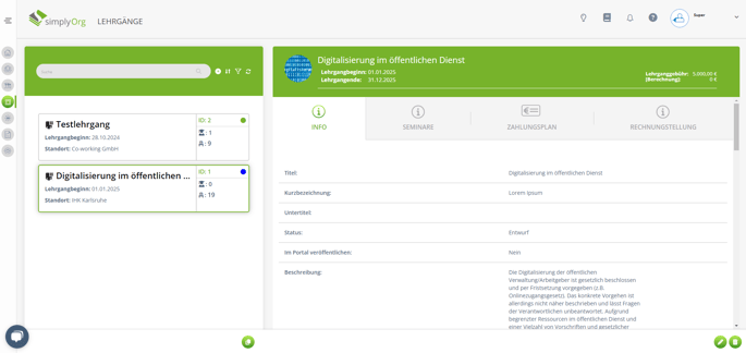 Lehrgänge sind längerfristig erstellt und können ebenfalls aufeinander aufbauende Seminare sein. Diese sind jedoch viel granularer. Ein Lehrgang kann aus einen Block bestehen, der wiederum aus verschiedenen Modulen und wiederum aus Teilseminaren besteht. Für Lehrgänge können keine Rechnungen im eigentlichen Sinne erstellt werden. Hierzu werden im simplyOrg Backend Zahlungspläne erstellt, die dann automatisch greifen und Rechnungen versandt werden.