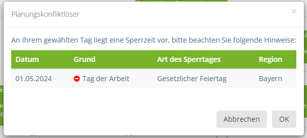 Sobald ein Seminar auf einen Zeitraum fällt, der als gesperrt markiert ist, erhalten Sie eine Meldung, ob Sie sicher sind, dass auf den gesperrten Zeitpunkt geplant werden soll. Die Planung des Seminares ist nicht ausgeschlossen. Beachten Sie dies bitte in Ihrer Planung.