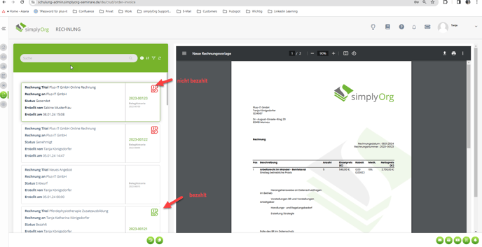 Sobald in simplyOrg eine Rechnung bestätigt wurde, wird sie an lexoffice übergeben. Zusätzlich wird ein Kontakt in lexoffice angelegt, mit dessen Vor- & Nachnamen, Adresse (Rechnungs- Kontakt- oder anderer Adresse), Anrede, Tel Nr. & E-Mailadresse. Die Rechnungen werden direkt in lexoffice manuell als "Bezahlt" markiert und dies wird dann mit simplyOrg synchronisiert. Der Zahlungsstatus wird mit Hilfe eines speziellen Icons in simplyOrg dargestellt. Ebenfalls möglich ist die Erstellung und Übertragung von Stornorechnungen. Auch diese werden an lexoffice übergeben.