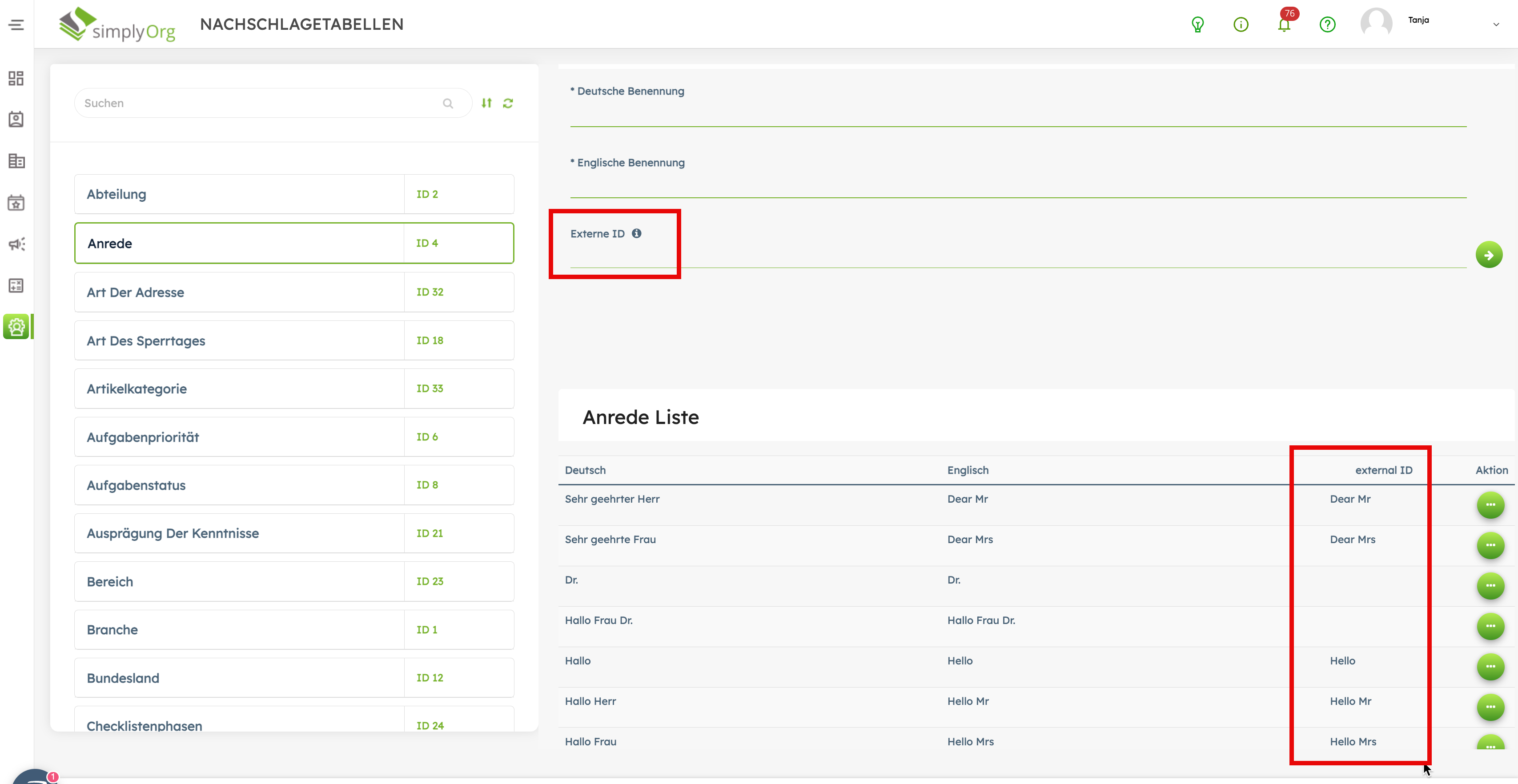 In den Nachschlagetabellen in der Administration gibt es das Feld "Externe ID". Diese kann genutzt werden, um Anreden via ID nach simplyOrg zu importieren. Dafür muss das Feld "Externe ID" entsprechend gefüllt und in der Importdatei aufgeführt werden.
