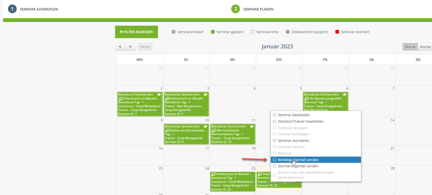 Wurde der Trainer nicht über das Modul "Traineranfrage" beauftragt sondern über den Seminarplaner oder der Seminarvorlage einem Seminar hinzugefügt, so kann mit Linksklick auf das jeweilige Seminar mit dem Menüpunkt "Bestätigungsmail senden" eine Mail mit der Bestätigung zum Seminar gesendet werden: