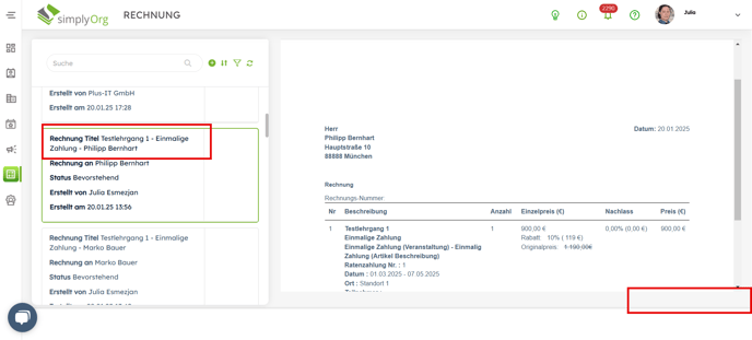 Löschen von Rechnungen für Lehrgänge
