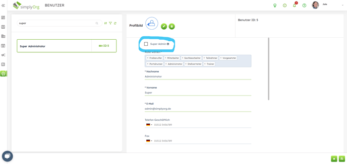 Festlegung der Rolle "Super Admin" im simplyOrg Backend.