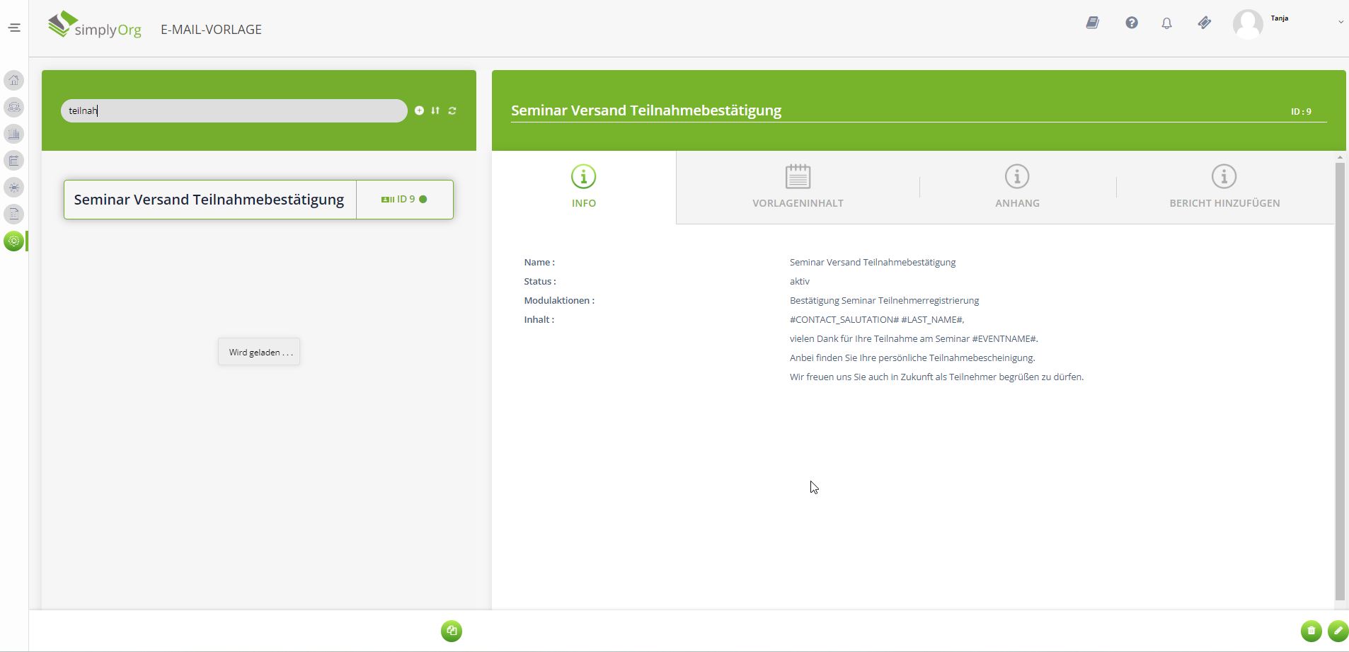 In der Administration unter dem Menüpunkt "E-Mailvorlagen" ist standardmäßig die Mailvorlage ID 9 für den Versand der Zertifikate/Teilnehmerbescheinigungen hinterlegt.