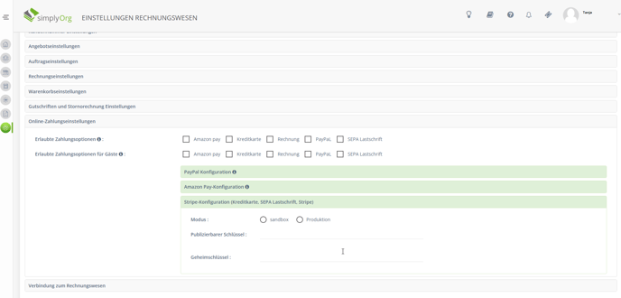 Die Informationen, die im Stripe Account zur Verfügung stehen, müssen in simplyOrg in der Administration: “Einstellungen Rechnungswesen” unter dem Menüpunkt “Online Zahlungseinstellungen” hinterlegt werden. Genaue Informationen finden Sie in unserem simplyOrg Benutzerhandbuch.