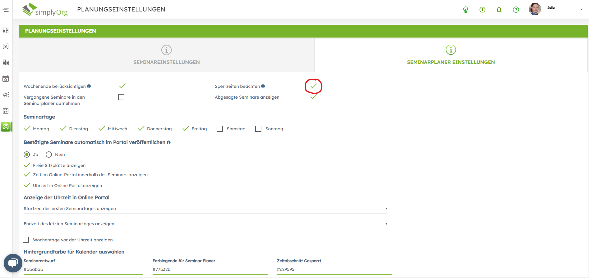 Im simplyOrg Backend unter Seminareinstellungen (Planungseinstellungen) können die Sperrzeiten mit Hilfe der Checkbox "Sperrzeiten beachten" für die Planung von Seminaren aktiviert werden.