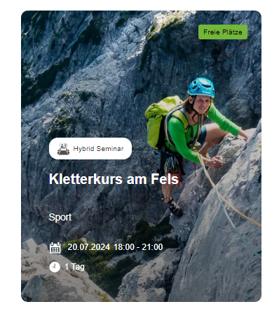 Ein hybrides Seminar im Online Portal erkennt man an dem Icon bzw. Symbol welches sich im Bild des Seminars befindet. Dort steht "Hybrid Seminar".