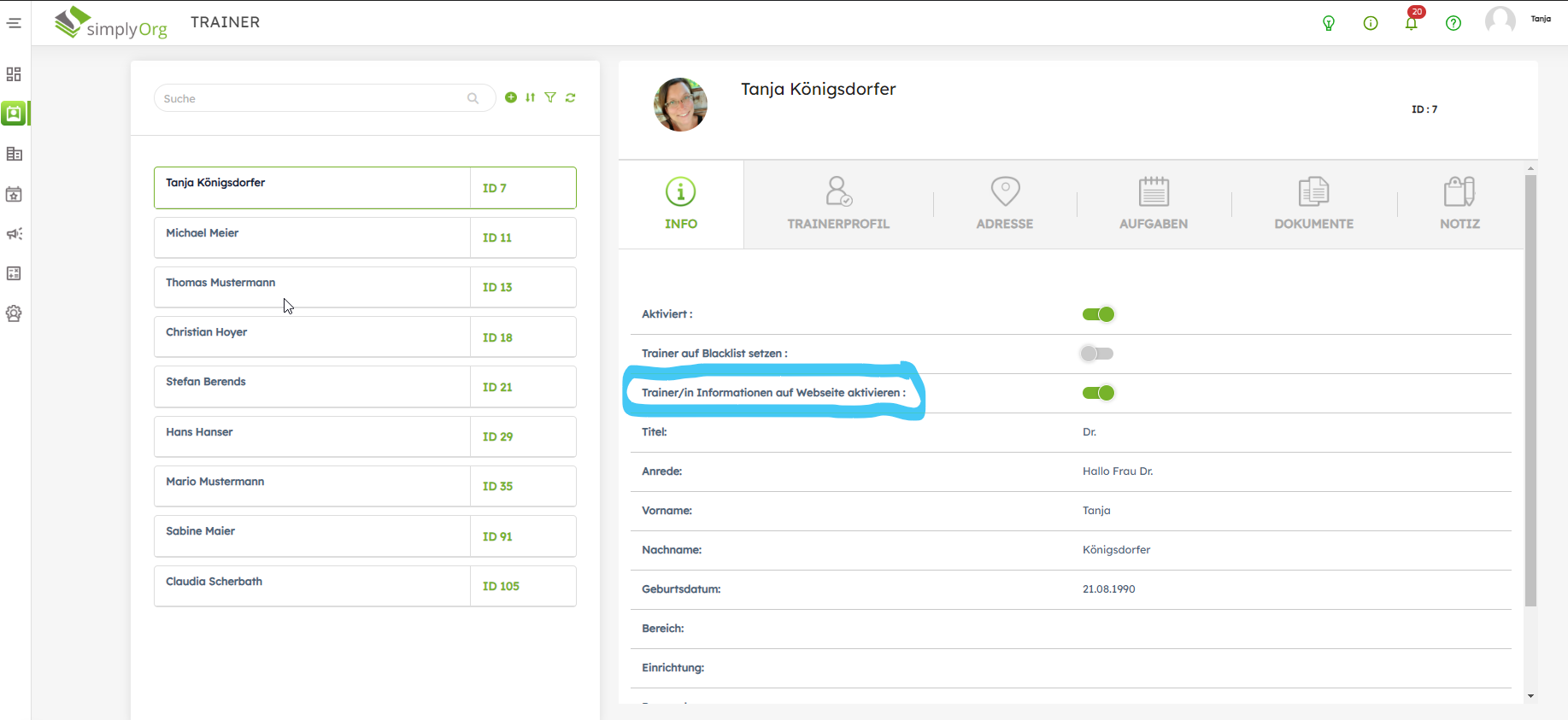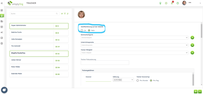 - Trainer -> Trainer auswählen -> Veröffentlichung auf der Webseite auf "Ja" setzen