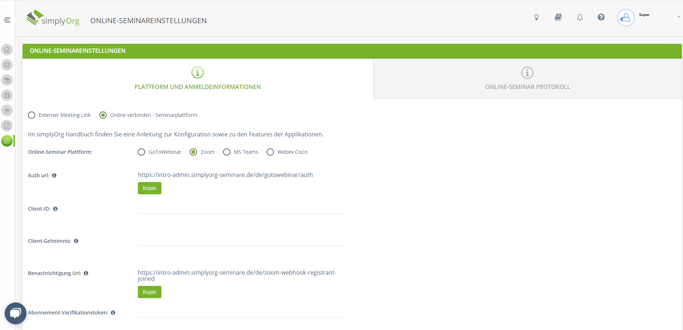 Verknüpfung von Online Seminar Plattformen mit simplyOrg in den Online-Seminareinstellungen