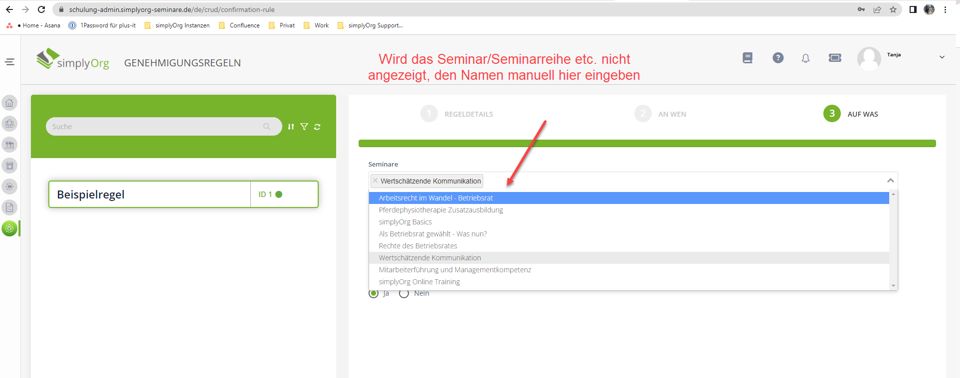 Anzeige der Seminarnamen bei Erstellung von Genehmigungsregeln