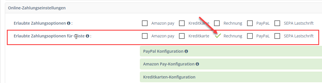 In der Administration unter “Einstellungen Rechnungswesen” unter dem Menüpunkt “Online-Zahlungseinstellungen” muss für den Gast-Checkout mindestens eine Zahlungsoption aktiviert sein. Wählen Sie die gewünschten Zahlungsmethoden aus und speichern Sie Ihre Änderungen.