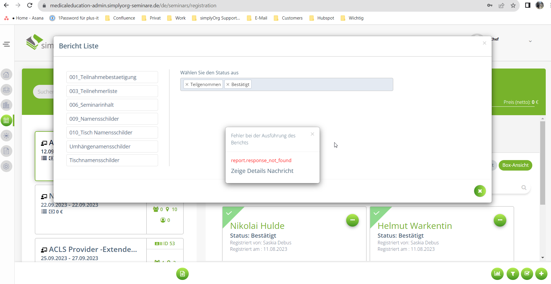 Bericht "Zertifikat"/"Teilnahmebescheinigung" kann nicht generiert werden - System zeigt Fehlermeldung "report.response.notfound"