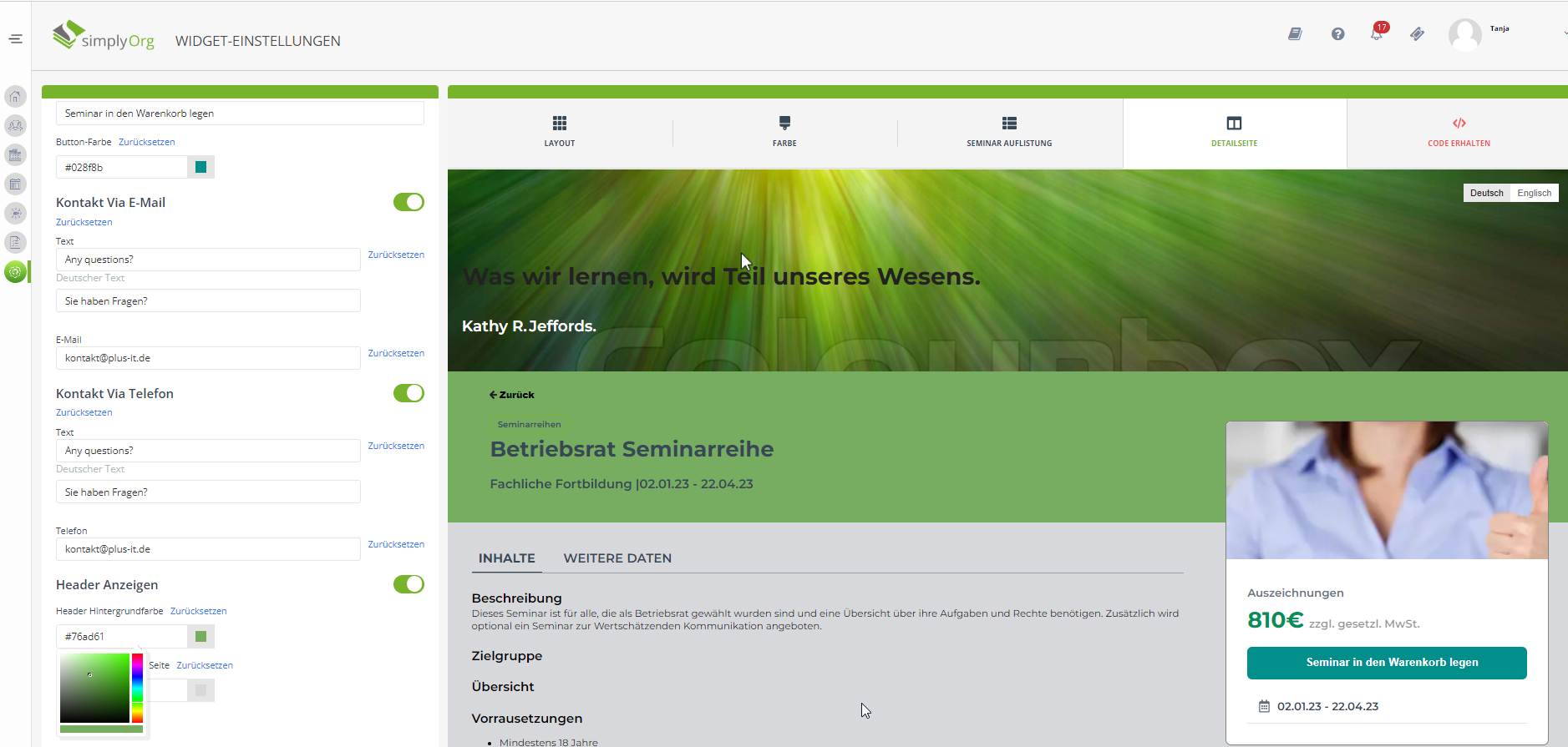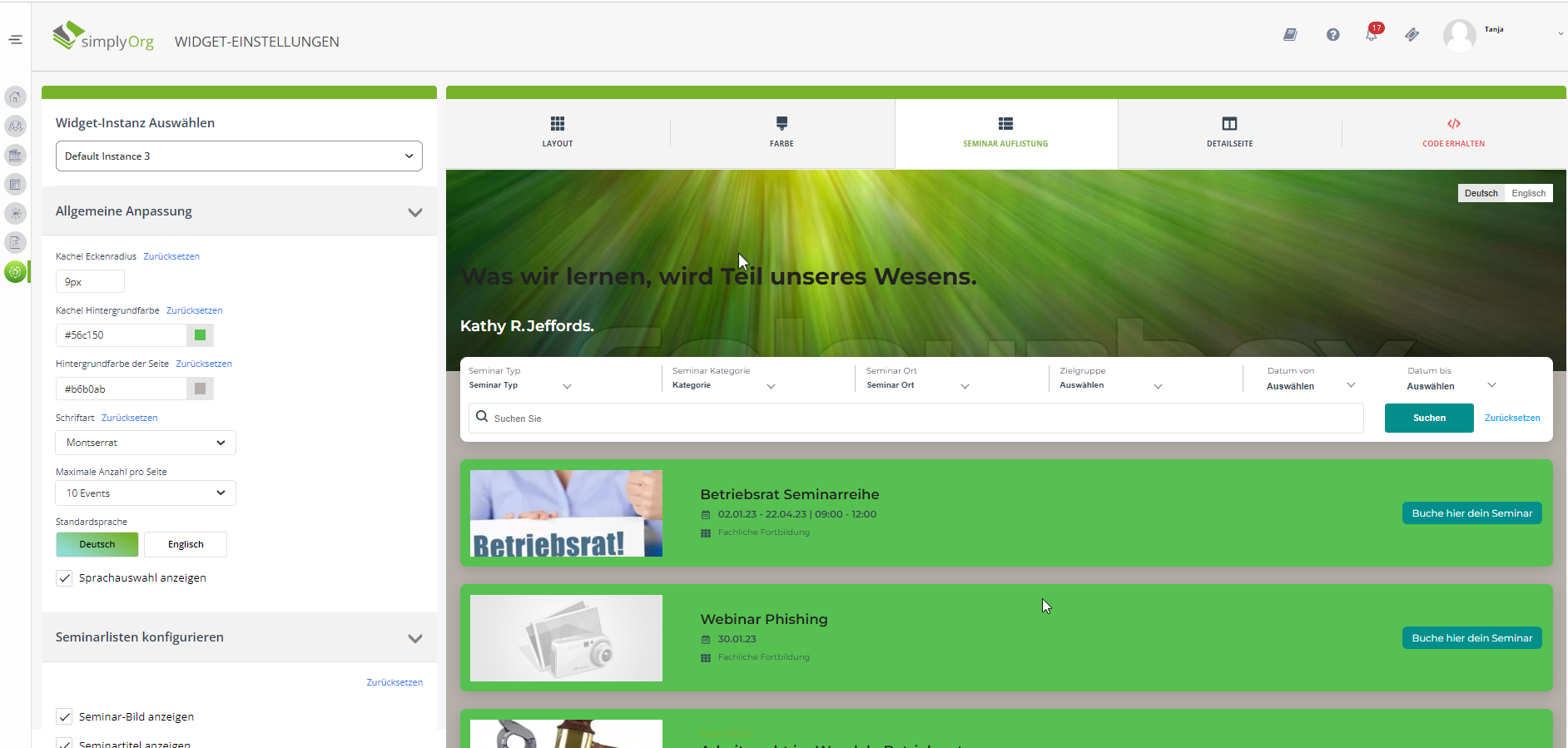 Mit der "Widget" Funktion, können Sie ein eigenes, an Ihr Unternehmen angepasstes Layout erstellen. Es wird ein Java Script Code generiert dieser kann dann in Ihr Intranet/Ihre Website eingefügt werden. Das bietet Ihnen die Möglichkeit das in simplyOrg erstellte Seminarangebot auf Ihrer Website zu veröffentlichen und für Ihre Teilnehmer buchbar zu machen.