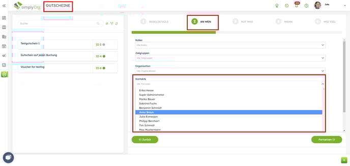5. Wählen Sie unter "Kontakte" den Kontakt aus, auf den der Gutschein gelten soll.