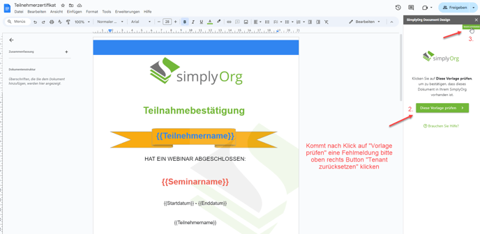 Taucht diese Meldung in Google Docs auf, so ist Ihr Google Account vermutlich nicht mit Ihrem simplyOrg Backend verknüpft. Hierfür können Sie folgende Schritte durchführen: