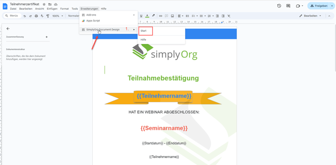 1. In Google Docs die Erweiterung "simplyOrg Document Design" starten