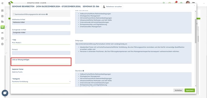 Wenn Sie Online Seminare planen, wobei ein externer Meetinglink verwendet wird, müssen Sie einen Link hinzufügen. Das System weist Sie darauf hin, sollten Sie ohne Link speichern wollen: