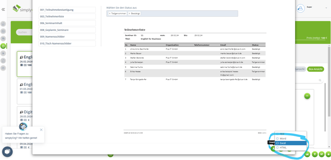 Herunterladen der Teilnehmerliste und Export in Excel