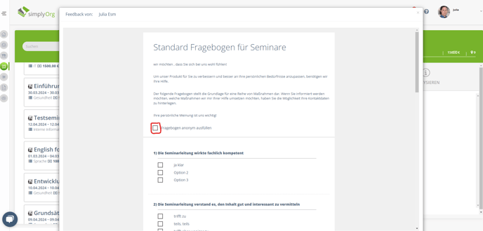 Einstellung im Backend, sodass ausgefüllte Feedbackbögen per Default anonym sind