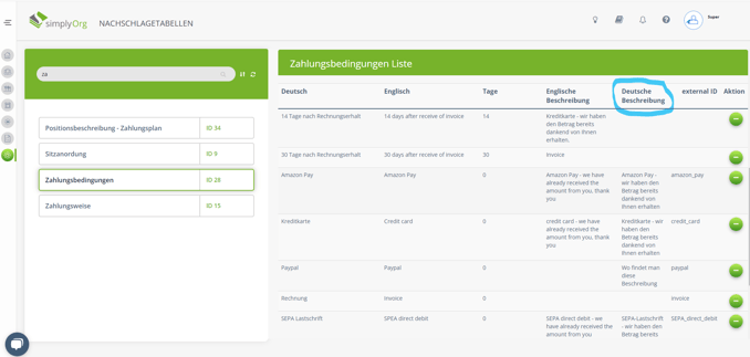 Ja, grundsätzlich können Hinweistexte (individuell) in buchhalterischen Dokumenten hinzugefügt werden. Gehen Sie dazu in die Administration im simplyOrg Backend und öffnen Sie die "Nachschlagetabellen". Unter dem Suchbegriff "Zahlungsbedingungen" können Sie im Tab "Deutsche Beschreibung" einen individuellen Text hinzufügen, der dann auf dem buchhalterischen Dokumenten angezeigt wird.