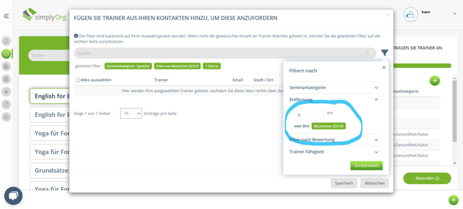 Kann simplyOrg exakt berechnen wie viele Kilometer zwischen dem Seminarort und dem Wohnort des Trainers liegen?