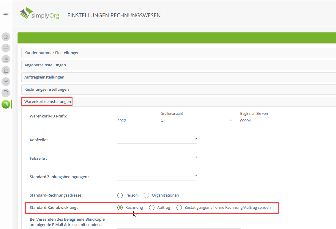 Automatisch erzeugte Rechnungen kommen normalerweise nur bei Buchungen aus dem Portal. Ob bei Buchung eine Rechnung generiert und versendet werden soll, kann in der Administration in den “Einstellungen Rechnungswesen” unter der Kategorie “Warenkorbeinstellungen” eingestellt werden. Ist im System ist als Standardkaufabwicklung “Rechnung” ausgewählt, werden bei Buchung aus dem Portal automatisch Rechnungen generiert.